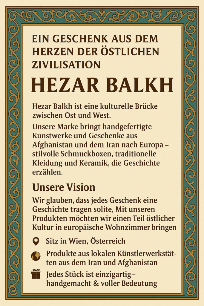 Hezar Balkh ist eine kulturelle Brücke zwischen Ost und West. Unsere Marke bringt handgefertigte Kunstwerke und Geschenke aus Afghanistan und dem Iran nach Europa – stilvolle Schmuckboxen, traditionelle Kleidung und Keramik, die Geschichte erzählen.